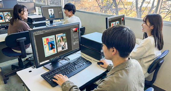 IllustratorやPhotoshopなどのデザインソフトを使用し、デザインの基礎からレイアウト、配色など、視覚的な表現力を身につけます。