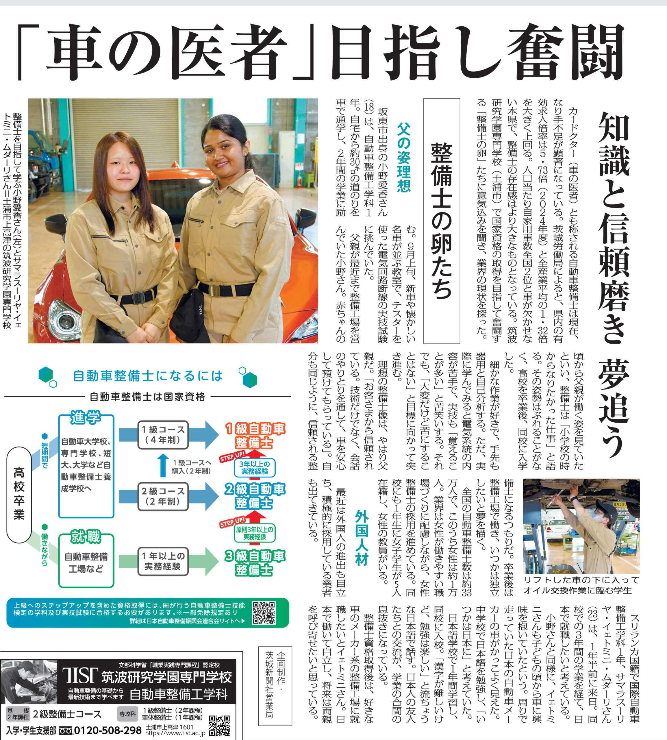 このたび、本学科で自動車整備士の夢を追う学生の姿が、9月13日付の茨城新聞に掲載されましたので、ご紹介いたします。